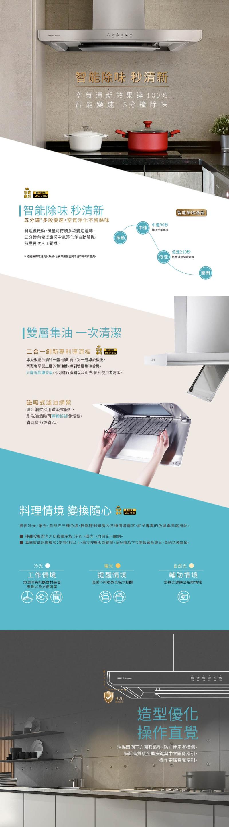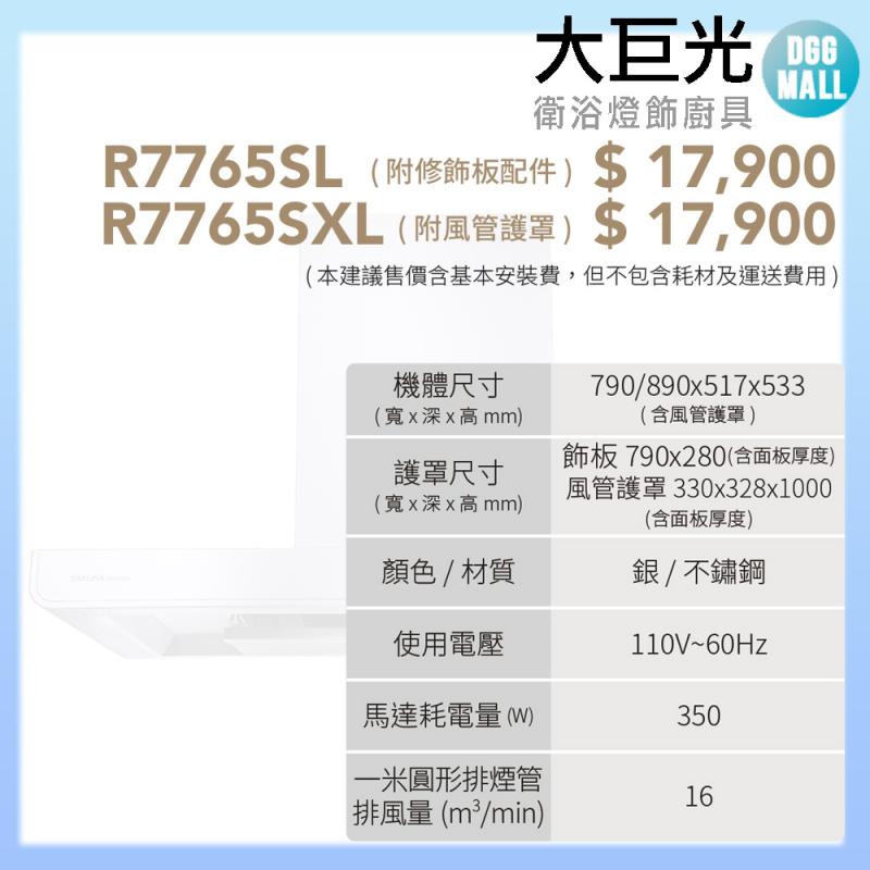 【大巨光】櫻花牌 R7765SXL 歐化除油煙機-渦輪變頻 環吸系列 89CM