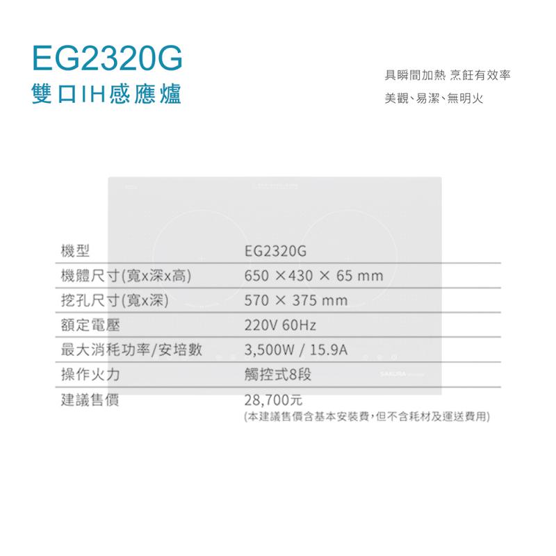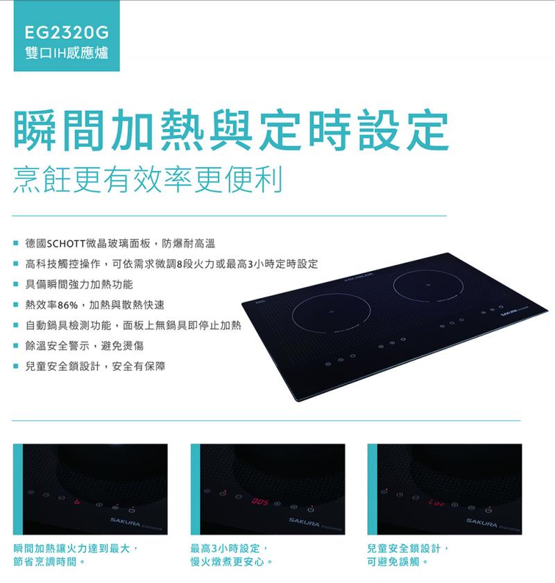 【大巨光】櫻花牌 EG2320GB雙口IH感應爐 德國SCHOOT微晶玻璃面板,防爆耐高溫