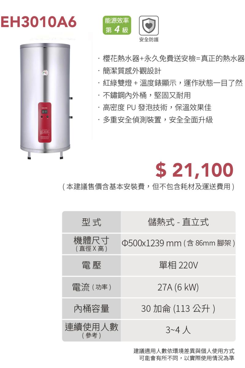 【大巨光】櫻花SAKURA 儲熱式電熱水器 EH3010A6