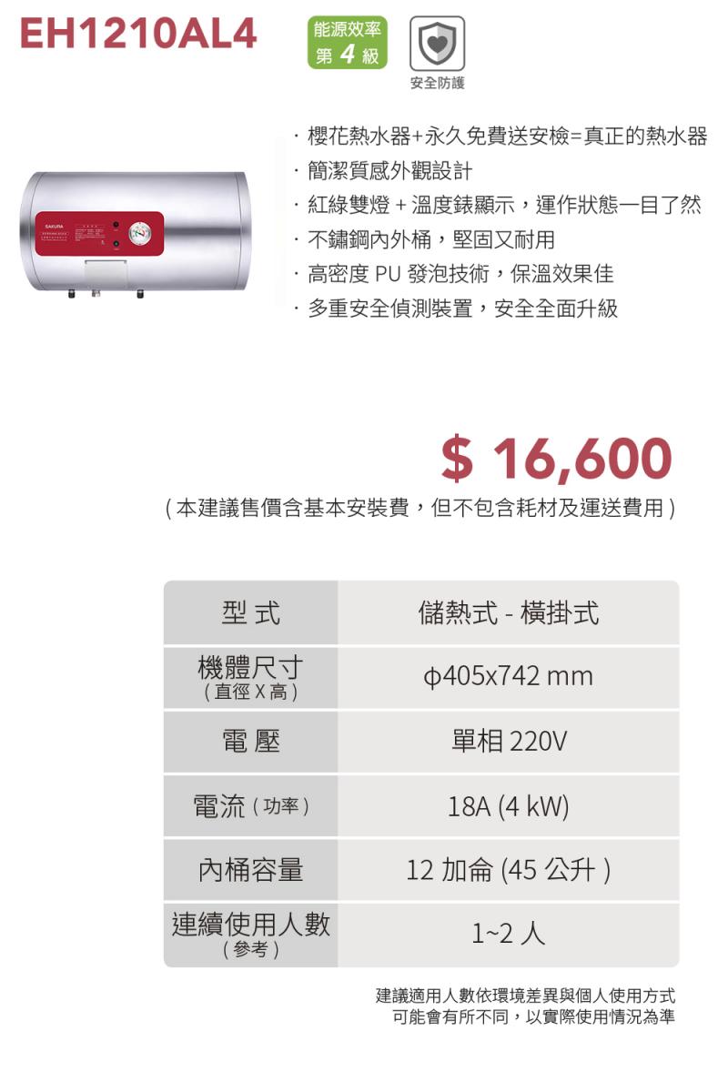 【大巨光】櫻花SAKURA 儲熱式電熱水器 EH1210AL4