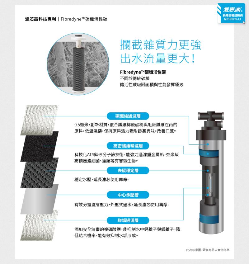 Fibredyne™濕式碳纖活性碳:濾網、碳纖一體成型,獨特活性碳粉與纖維活性碳複合配方,可迅速增加可運用的淨水量,及時應付大量用水的料理時刻;悠閒地與家人享用美食,輕而易舉。