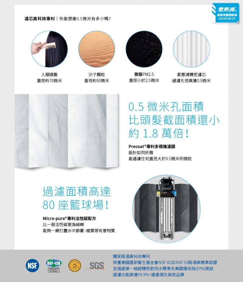 專利活性碳配方Micro-Pure:真實通過NSF認證,比一般活性碳更為細緻,想像一下,Micro-Pure的微小顆粒能一網打盡80座籃球場面積的氯、雜質等有害物質