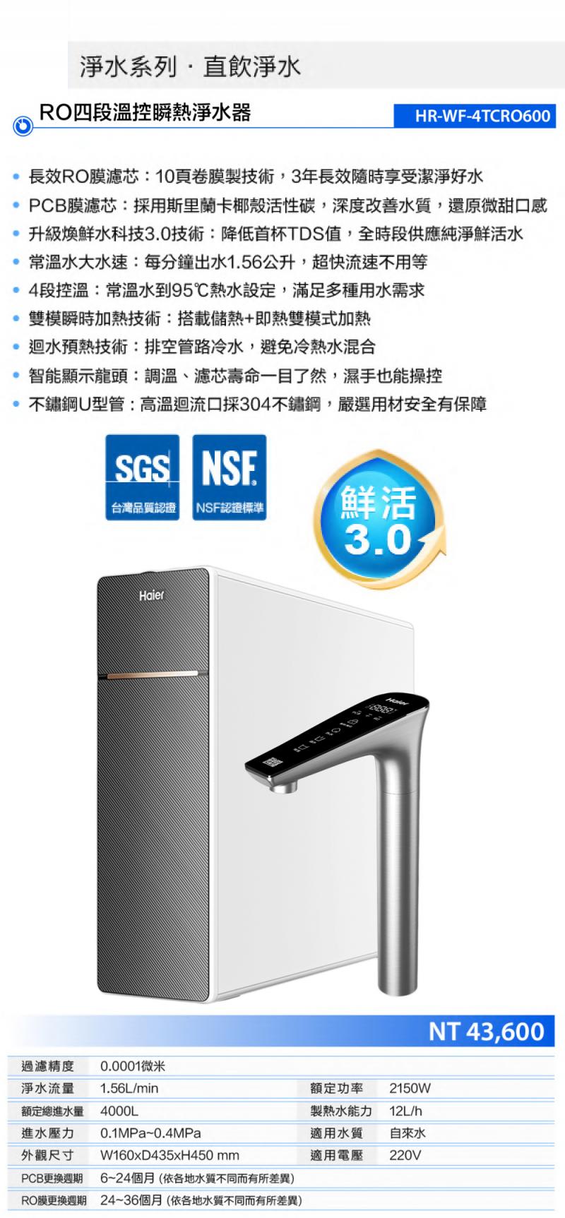 【大巨光】海爾 Haier 鮮活3.0 RO四段溫控瞬熱生飲淨水器 HR-WF-4TCRO600