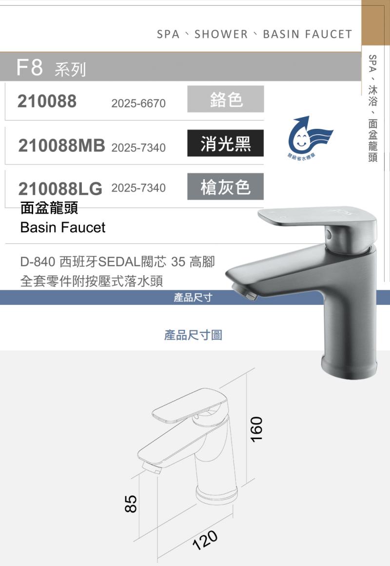【大巨光】槍灰色 210088LG 面盆龍頭 西班牙 SEDAL 閥芯 全套零件附按壓式落水頭